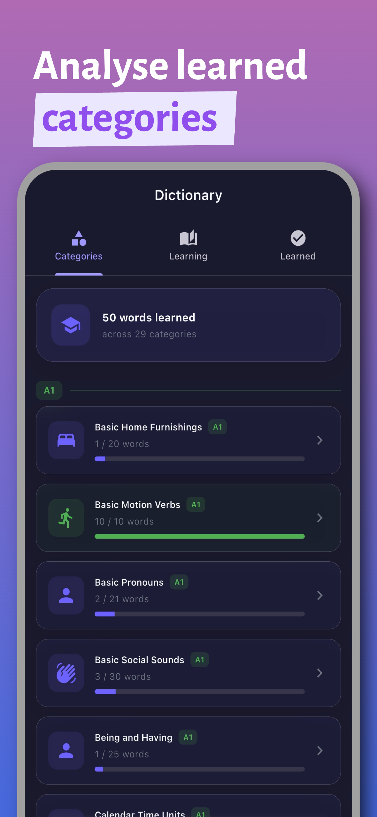 Stay motivated with measurable goals. Tracking your word count and maintaining your learning streak are two of the strongest predictors of long-term success. Set a target: 500 words by month two, 1,000 by month four. When you can see your progress on a chart, the motivation takes care of itself.